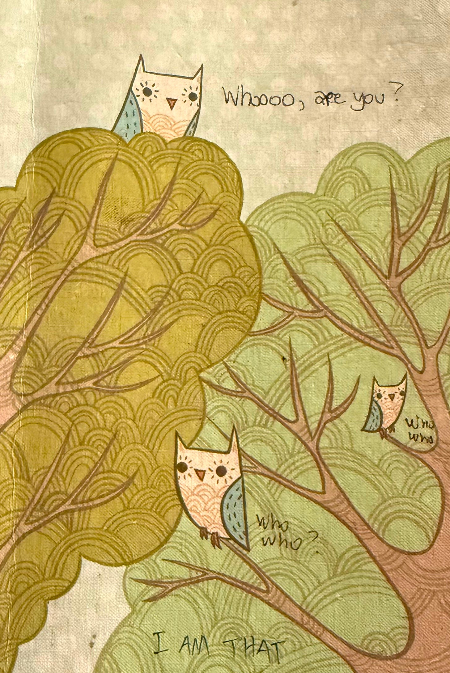 On the cover, three hand-drawn owls sit among trees. I had playfully added: Whoooo are you? on the first owl, with the others answering back “Who Who Who Who?”